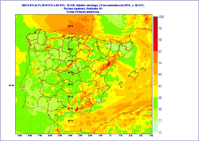 En el Valle del Guadalentín, es probable que las rachas máximas estén entre 60 y 80 km/h, según zonas, más intensas en zonas de montaña como Sierra Espuña. Las rachas más intensas se espera que se registren entre las últimas horas de la madrugada y la mañana.