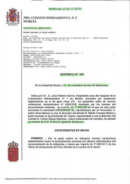 Sin ir más lejos, el 26 de noviembre 2019, recibimos la sentencia 2545/2019 del Juzgado Contencioso Administrativo por el que se condenaba al pueblo e Totana a abonar 71.822,32 euros en concepto de una parte de las obras de Restauración del Arco de las Ollerías que data (la obra de 2006) de 13 años en el que se incluyen intereses.