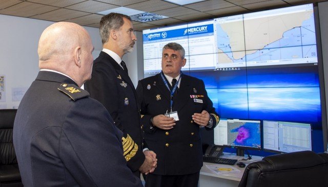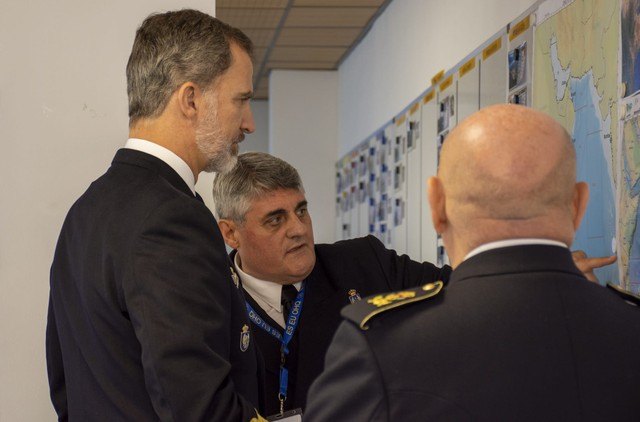 Durante la visita, el Capitán totanero de Corbeta Diego Cánovas Cánovas expuso a SM el rey el funcionamiento del centro de operaciones así como el estado actual de la operación y las relaciones con el sector mundial del transporte marítimo, de importancia vital para el bienestar de la humanidad, habida cuenta de que en torno al 90% de las mercancías se transportan por mares y océanos.