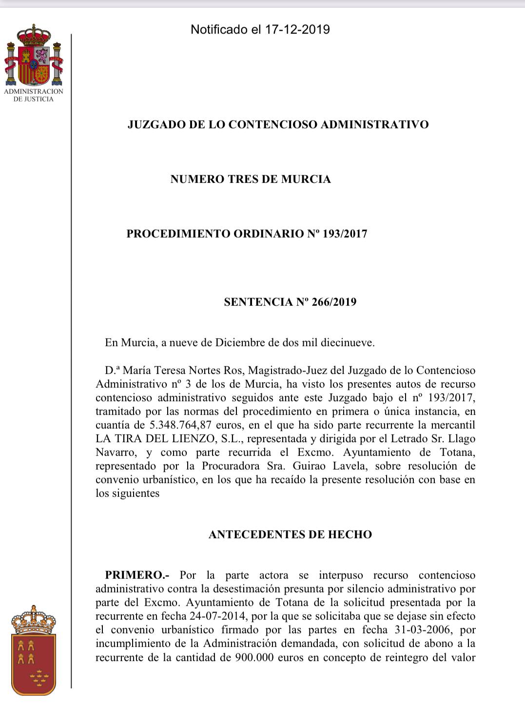 "El Tribunal Contencioso Administrativo número 3 de Murcia, liquida el último Convenio Urbanístico de Juan Morales y el Partido Popular, firmado en 2006 y rebaja las pretensiones de 6.570.542,79 € más intereses y costas que reclamaban los dueños de la TIRA DEL LIENZO donde se ubica la Ciudad Deportiva en 2.545.202,74 euros, condicionando el pago a la entrega de los terrenos libres de cargas.