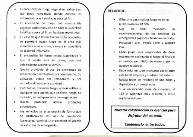 Además, por motivos de conservación de la biodiversidad del parque regional de Sierra Espuña y por la peligrosidad sobre acumulación de combustible y seguridad frente al riesgo de incendio forestal, no se permitirá el acceso ni encendido de fuego alguno, en zonas forestales del entorno cubiertas de vegetación natural.