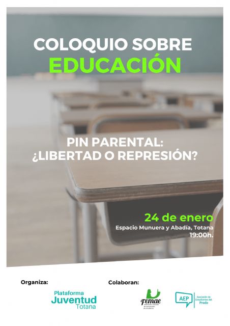El próximo viernes 24 de enero tendrá lugar un coloquio, organizado por la Plataforma de la Juventud de Totana en colaboración con la Asociación de Estudiantes del IES Prado Mayor y FEMAE, para hablar sobre educación, con motivo de la celebración, ese mismo día, del Día Internacional de la Educación.
