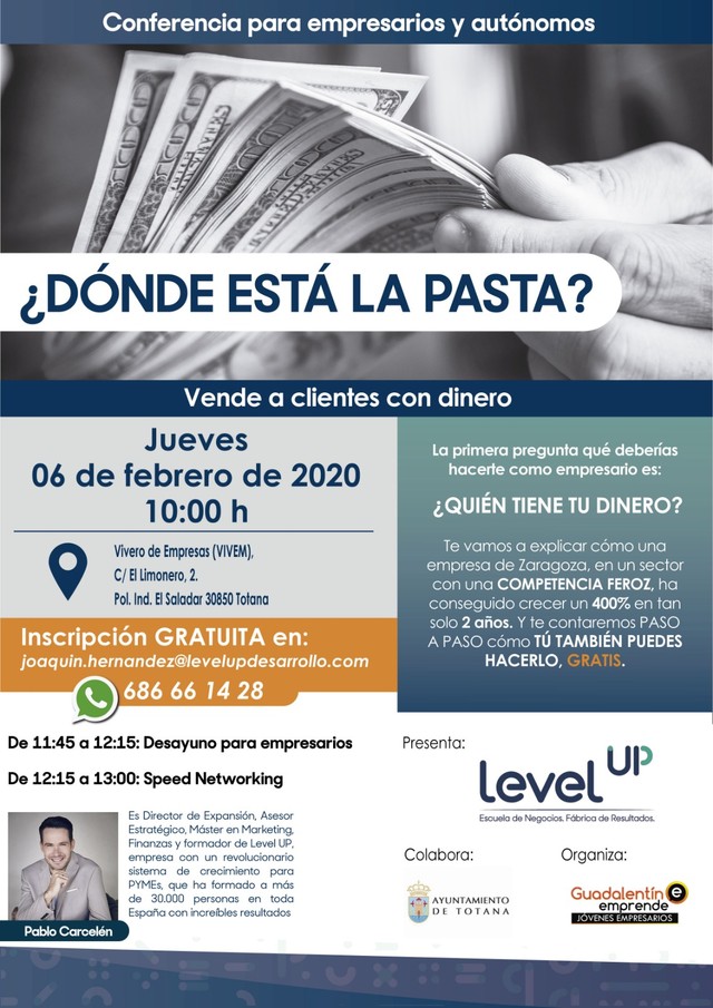 La Asociación "Guadalentín Emprende. Jóvenes Empresarios" organiza la conferencia dirigida a empresarios y autónomos "¿Dónde está la pasta?" este próximo jueves 6 de febrero en el Vivero de Empresas, presentada por "Level UP. Escuela de Negocios", con la colaboración del Ayuntamiento de Totana.