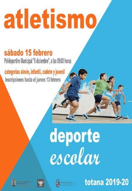 La Concejalía de Deportes tiene previsto organizar el próximo sábado 15 de febrero la Fase Local de Atletismo de Deporte Escolar, a partir de las 9:00 horas, en el polideportivo municipal "6 de diciembre", dirigida a las categorías alevín, infantil, cadete y juvenil, tanto en modalidad masculina como femenina.
