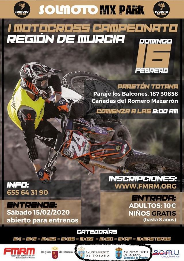 Según ha podido saber este Ayuntamiento, el próximo domingo comienza el Campeonato de Motocross de la Región de Murcia y el Open de Murcia en el denominado circuito Solmoto Mx Park, que se encuentra entre el paraje Los Balcones de la diputación totanera de El Paretón-Cantareros y las Cañadas de Romero, en el término municipal de Mazarrón.