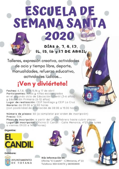 La Junta de Gobierno Local ha acordado recientemente suscribir un convenio con el Colectivo para la Promoción Social "El Candil" para realizar el proyecto "Escuela de Vacaciones de Semana Santa´2020", que se celebrará los días, 6, 7, 8, 13, 14, 15, 16 y 17 de abril de 2020.