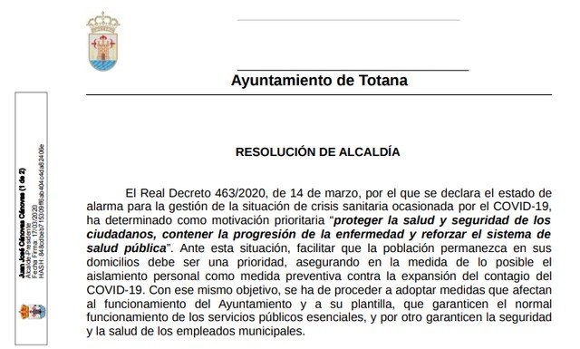 El alcalde, Juan José Canovas, ha dictado dos resoluciones urgentes declarando los servicios mínimos municipales esenciales y la reorganización de los empleados públicos para gestionar la situación de crisis sanitaria y contener la progresión de la epidemia en este municipio, como mínimo hasta el 30 de marzo, sin perjuicio de las sucesivas prórrogas que sean acordadas por el estado de alarma.