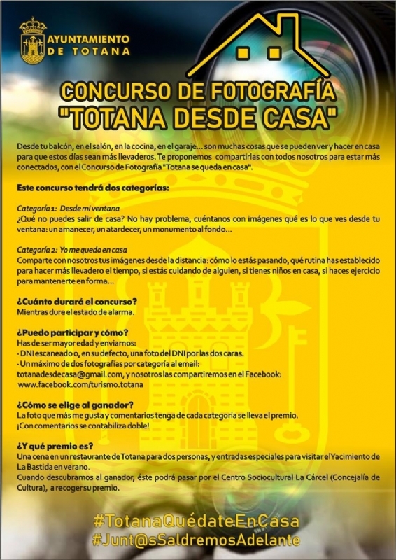 Los trabajos (y documentación adjunta) se han de enviar al correo electrónico configurado para la ocasión totanadesdecasa@gmail.com y, además, se compartirán en los perfiles de Facebook del Ayuntamiento de Totana (Turismo).