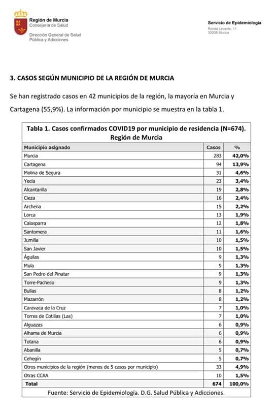 Según se desprende del informe oficial de la Consejería remitido al Ayuntamiento, en la Región de Murcia hasta la fecha del informe con fecha de 27 de marzo, se han registrado 802 casos confirmados de infección por COVID19. El primer caso se declaró el 6 de marzo y se confirmó como positivo el 8 de marzo.
