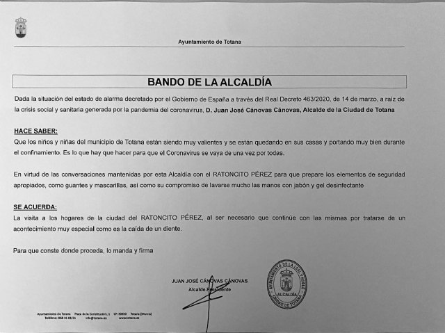 El alcalde de Totana, Juan José Cánovas, dictó a última hora de hoy un Bando en el que autoriza al Ratoncito Pérez a que salga a la calle, de forma exclusiva y excepcional, para visitar los hogares de este municipio ante el caso de que a los niños o niñas se les caiga un diente durante estos días de confinamiento.