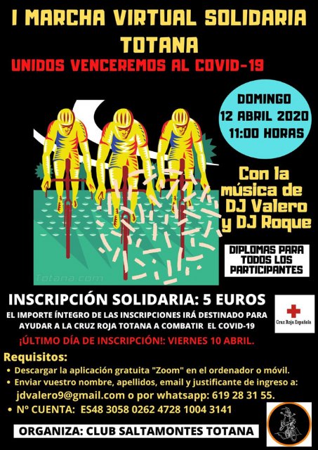 La idea, añaden, es pagar una inscripción de 5 euros que irá destinada íntegra a Cruz Roja Totana para apoyarles en su lucha contra el Covid-19 de la mejor manera que ellos crean oportuno.