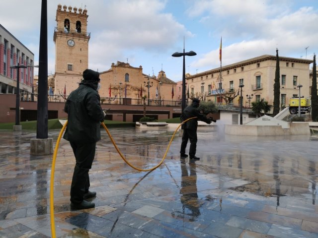 Varias unidades de brigadas forestales de la Dirección General de Medio Natural han desplegado hoy a cerca de una treintena de efectivos en Totana y la pedanía de El Paretón-Cantareros para realizar labores de limpieza y desinfección, con agua y lejía a presión, en los espacios públicos más transitados del casco urbano y esa diputación, dotados de vehículos y material técnico.