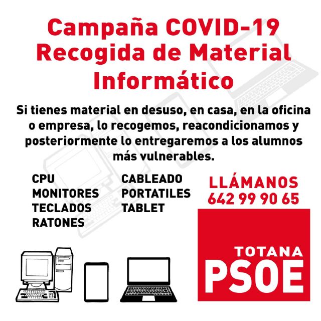 Para ello, PSOE de Totana pone, a disposición de familias y empresas que quieran donar material informático, un servicio de recogida de este tipo de material. Posteriormente, procederán a su desinfección y reacondicionamiento para que puedan ser reutilizados. Por último, en coordinación con los centros educativos de Totana, los equipos informáticos se les hará llegar a los alumnos y alumnas que los centros hayan identificado como carentes de estos medios.