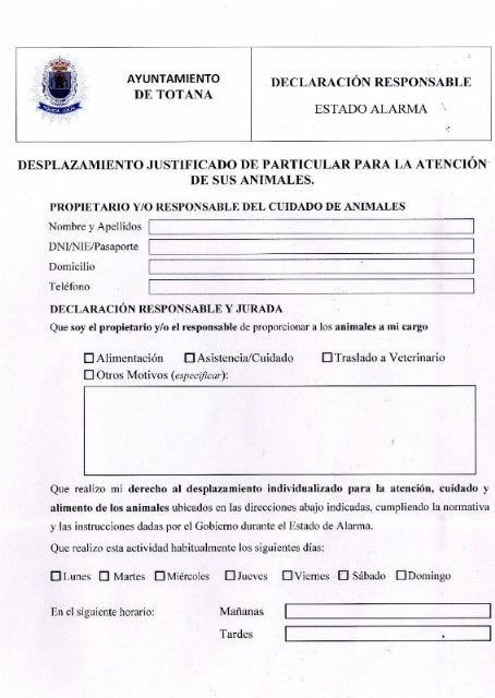 La Mesa de Coordinación Policial del COVID-19 en el municipio de Totana ha acordado proporcionar una herramienta útil, mediante una declaración responsable, que permita el desplazamiento exclusivo y justificado de la atención y cuidado de animales a particulares residentes en este municipio.