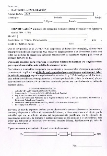 Con este documento se pretende dar cuenta a los agentes policiales de tal circunstacia (en cualquier momento estos pueden comprobar esta circunstancia en esta coyuntura excepcional acompañando al propietario hasta el lugar donde se encuentren los animales), y evitar casos en los que, de no atender a estos animales o impedir su cuidado, presuntamente pudieran ser constitutivo de un delito de maltrato animal por comisión por omisión en el deber de cuidado adecuado.