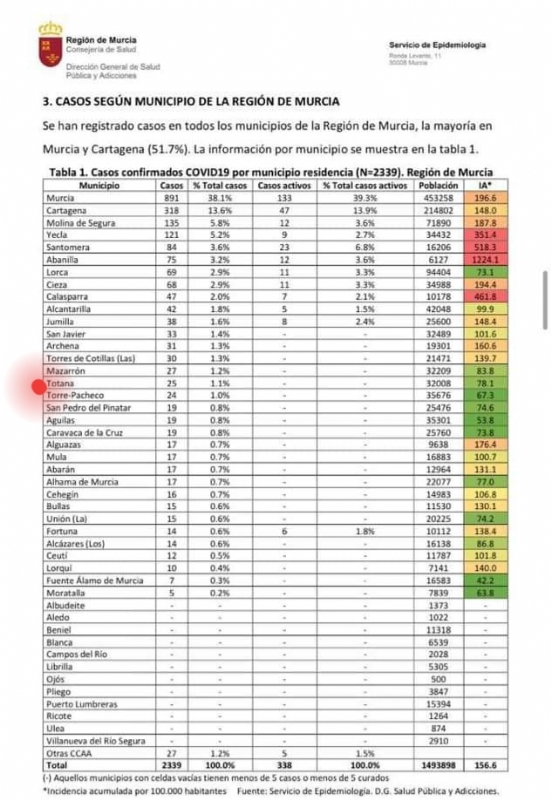 El municipio de Totana ha aumentado en seis el número de contagios durante los últimos días respecto al último informe epidemiológico por coronavirus, registrando un total de 25 desde que comenzó la crisis sanitaria, según se desprende de los datos facilitados esta noche por la Consejería de Salud.