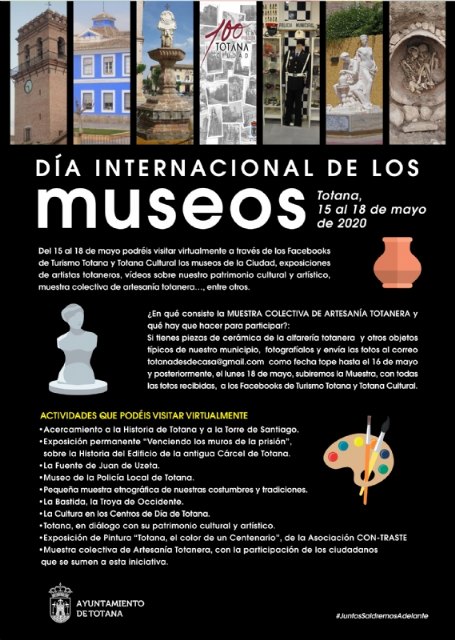Si tienes piezas de cerámica de la alfarería totanera y otros objetos típicos de este municipio, los puedes fotografiar y enviar las fotos al correo totanadesdecasa@gmail.com como fecha tope hasta el 16 de mayo; de forma que, posteriormente, el lunes 18 de mayo, se subirán todas las imágenes de la Muestra Colectiva de Artesanía, con todas las fotos recibidas, a los perfiles de Facebook de Turismo Totana y Totana Cultural.