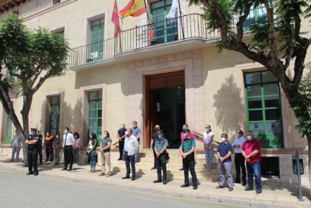El alcalde de Totana, Juan José Cánovas, acompañado de los portavoces de los grupos municipales y concejales de la Corporación, han guardado este mediodía un minuto de silencio en memoria de los fallecidos durante la pandemia del coronavirus, cuyo acto ha tenido lugar a las puertas del Consistorio totanero, en la plaza de la Constitución.