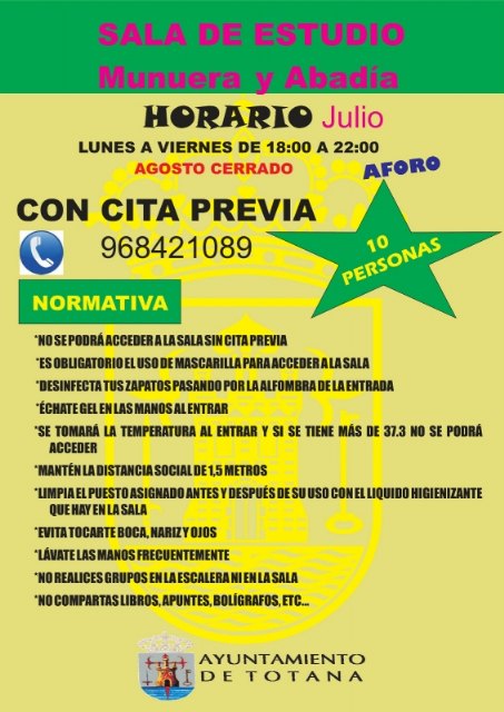 La apertura de la Sala de Estudio del Centro se canalizará mediante cita previa en el teléfono 968421089, con horario de 18:00 a 22:00 horas, de lunes a viernes en horario de verano. Además, durante el mes de agosto estará cerrado, y a partir de septiembre, éste será de 17:00 a 21:00 horas.