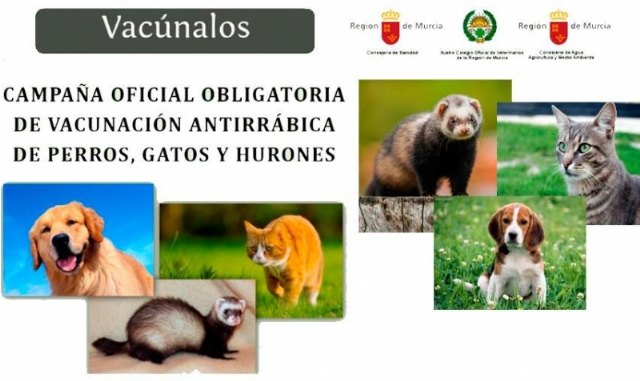 La Concejalía de Sanidad del Ayuntamiento de Totana recuerda que durante los meses de julio y agosto se lleva a cabo la campaña anual de vacunación antirrábica obligatoria para los animales de las especies canina, felina y hurones, promovida conjuntamente con las Consejerías de Salud y Agricultura, Ganadería, Pesca y Medio Ambiente de la Comunidad Autónoma junto con el Ilustre Colegio Oficial de Veterinarios de la Región de Murcia.