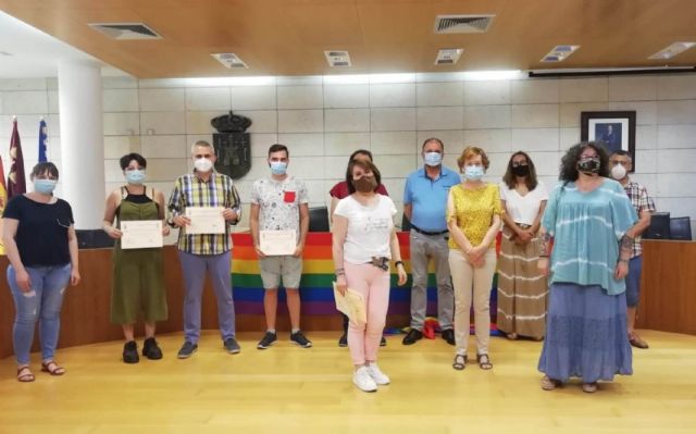 El alcalde, Juan José Cánovas, acompañado por el concejal de Igualdad, Javier Baños, y la edil Maribel Rubio, entregaron ayer los premios del I Concurso de Poesía, Relato Breve y Cómic organizado por el Ayuntamiento de Totana con motivo de la celebración de los actos conmemorativos del Día del Orgullo LGTBI.