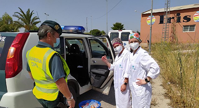 Es mediodía en Totana y el termómetro marca 35 grados a la sombra, cosa de la que carecen los guardias civiles encargados de controlar y vigilar los accesos al municipio de Totana. Es por eso que desde la Residencia La Purísima se han movilizado para poder hacer más llevadero el calor de los agentes y han cargado la furgoneta de la residencia y se han acercado hasta uno de los puntos de control para hacerles entrega de refrescos y agua fría para que pueda mantenerse hidratados y seguir desempeñando su trabajo.