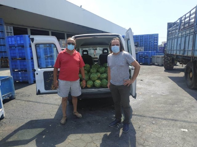 Agricultores y cooperativas de Totana han entregado hace unos días varios portes de fruta fresca, básicamente melones y sandías, que irán destinados a Cáritas de las Tres Avemarías de esta localidad gracias a las gestiones del concejal de Bienestar Social, Javier Baños.