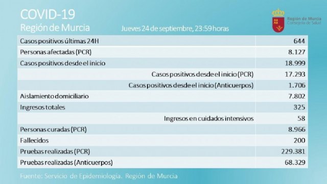 De los 644 nuevos casos en la Región de Murcia en las últimas 24 horas, 144 corresponden al municipio de Murcia, 118 a Totana, 52 a Molina de Segura, 49 a Cartagena, 40 a Lorca, 31 a Jumilla, 13 a Santomera, 12 a Alcantarilla, 12 a Alguazas, 12 a Fuente Álamo, 12 a La Unión, 11 a Archena, 11 a Mazarrón, 11 a Torre Pacheco, 11 a Las Torres de Cotillas, 10 a Alhama de Murcia, 10 a Cieza, 8 a San Javier, 7 a Ceutí, 6 a Caravaca de la Cruz . El resto están repartidos entre diversas localidades.