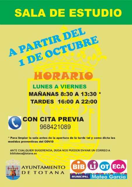 La Concejalía de Cultura informa que los servicios horarios de la Biblioteca Municipal “Mateo García” y la Sala de Estudio del Centro Sociocultural “La Cárcel” se amplían a partir de mañana, día 1 de octubre, con medidas específicas que permitan su uso garantizando las medidas de prevención sanitarias.
