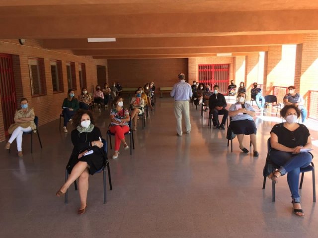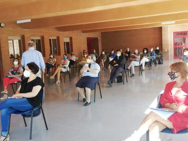Representantes de la comunidad educativa de Totana se han reunido hoy en el IES Juan de la Cierva con responsables del proyecto piloto integral de actuación sociosanitaria y comunitaria que el Servicio Murciano de Salud está desarrollando en este municipio con la pretensión de explicar alternativas y convertir los centros educativos del municipio en estructuras resilientes frente al COVID-19.