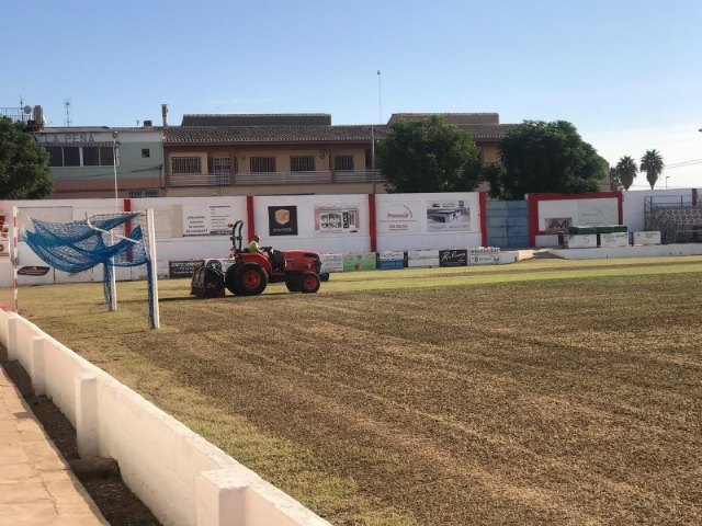 La Concejalía de Deportes del Ayuntamiento de Totana está realizando durante esta semana los trabajos de acondicionamiento y resiembra de invierno del césped del estadio municipal de fútbol "Juan Cayuela" con el fin de hacer uso en las mejores condiciones de esta instalación hasta finales de la presente temporada.