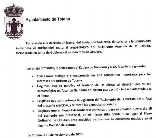 Hemos llegado a estos acuerdos después de ver que se estaba haciendo caso omiso a las opiniones mostradas públicamente por nuestros representantes, y considerar que se iba a perpetrar en despropósito, permitiendo que las piezas y los materiales arqueológicos obtenidos en las excavaciones de la Bastida serían trasladados al almacén del Museo Arqueológico en la población de Alcantarilla. Motivado por la finalización del contrato de seguridad privada en dicho yacimiento.