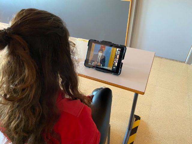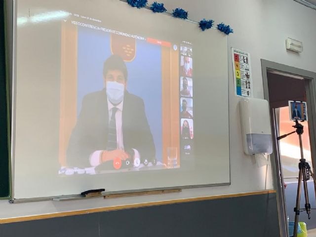 El Proyecto de Innovación Educativa: ‘Tengo una pregunta para usted’ diseñado por el Departamento de Geografía e Historia, tiene como principal objetivo que el alumnado de tercero y cuarto de la ESO se convierta en el protagonista de su propio proceso de aprendizaje para adquirir competencias mediante metodologías educativas innovadoras. Las nuevas tecnologías han jugado un papel fundamental para que la interacción de los estudiantes con el presidente regional, Fernando López Miras, respetase las restricciones de la actual pandemia de coronavirus. De forma que a través de Google Meet un total de cuatro aulas han realizado una videollamada simultánea al jefe del Ejecutivo murciano.