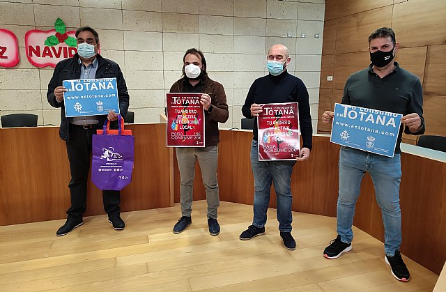 El concejal de Comercio, Javier Baños, junto con el presidente de la Asociación de Comerciantes, Francisco Andreo, y los responsables de las asociaciones profesionales de Hosteleros CHACT y ASEMHOS, Martín Miras y Jerónimo Costa, han dado cuenta de las condiciones y características de la puesta en funcionamiento de la campaña “Tu consumo en Totana” que se desarrollará, en principio, hasta el 28 de febrero.
