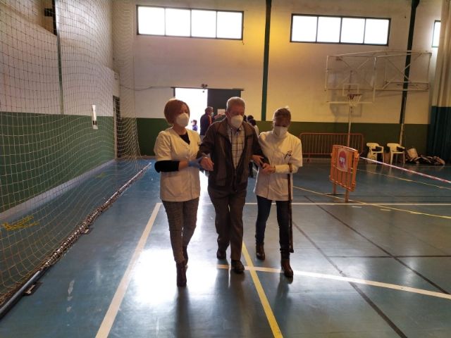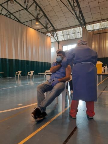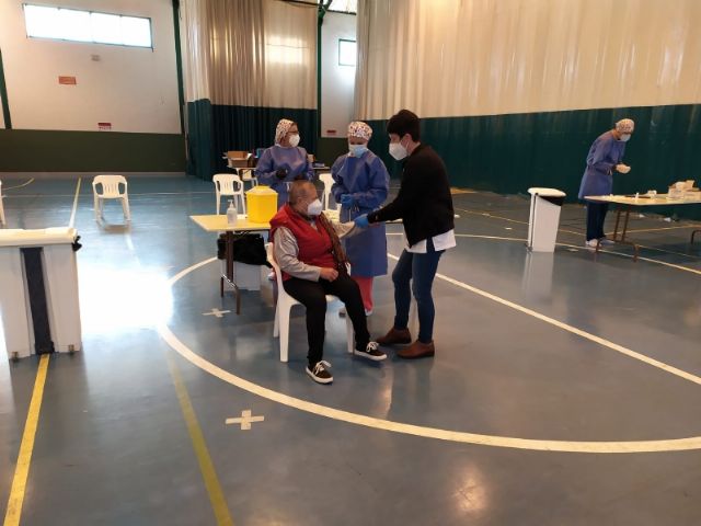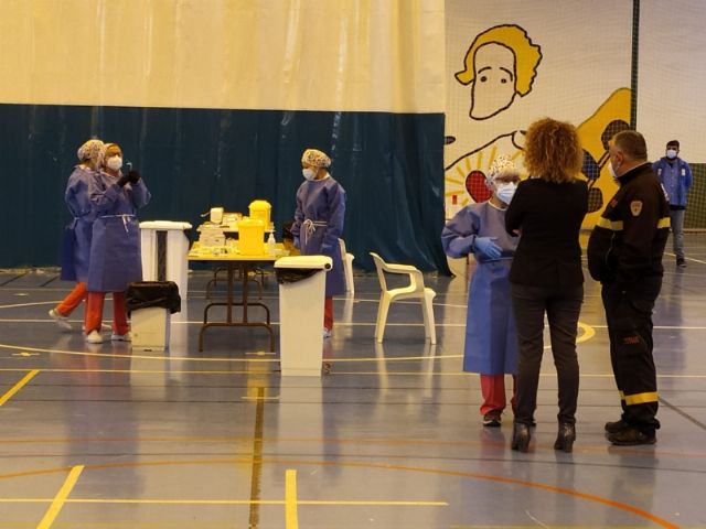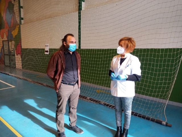El concejal de Bienestar Social y Discapacidad, Javier Baños, ha querido conocer de primera mano el proceso visitando estas instalaciones municipales y acompañando a los sanitarios del Centro de Salud Totana Sur que se han encargado de poner las primeras dosis, en un dispositivo que ha contado con la colaboración de los voluntarios de Protección Civil.