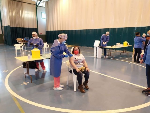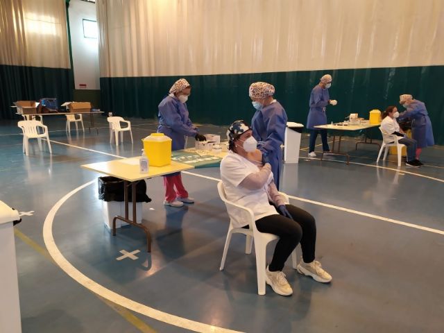 La Sala Escolar de Totana ha sido el lugar elegido para inocular las 129 vacunas de la primera dosis contra el COVID-19 a los usuarios y trabajadores sociosanitarios empleados en los 3 Centros de Día dependientes del Ayuntamiento, en este caso, los dos para la Discapacidad y el de Estancias Diurnas de Personas Mayores con los que cuenta la localidad.