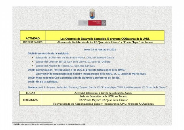 La Sede Permanente de Extensión de la Universidad de Murcia (UMU) en Totana va a celebrar mañana, lunes 15 de febrero, una jornada formativa telemática con un grupo de alumnos de Bachillerato de los dos IES, en este caso, los institutos Juan de la Cierva y Prado Mayor.