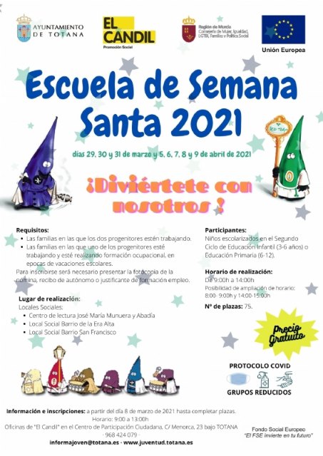 La Concejalía de Juventud informa de que el próximo lunes, día 8 de marzo, se abre el plazo de presentación de inscripciones  para la Escuela de Semana Santa.
