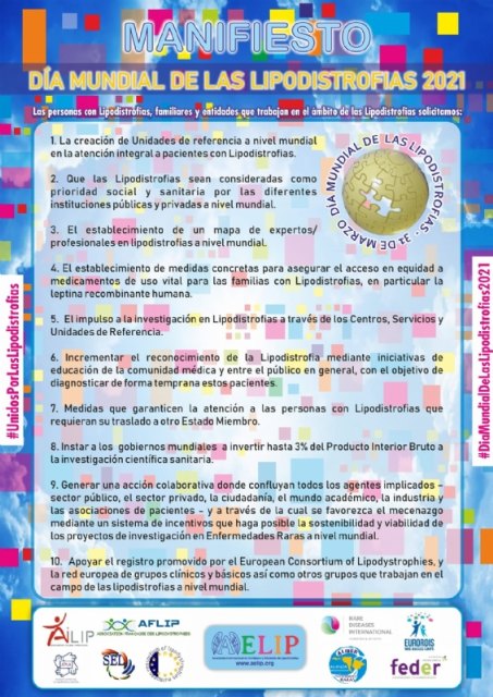 Asimismo, se piden medidas que garanticen la atención a personas con lipodistrofias que requieran su traslado a un estado miembro, instar a los gobiernos mundiales a invertir hasta el 3% del PIB a la investigación científica sanitaria y generar una acción colaborativa donde confluyan los agentes implicados -sector público y privado, la ciudadanía, el mundo académico, la industria y las asociaciones de pacientes- y a través del cual se favorezca el mecenazgo mediante un sistema de incentivos que haga posible la sostenibilidad y viabilidad de los proyectos de investigación en Enfermedades Raras a nivel mundial.