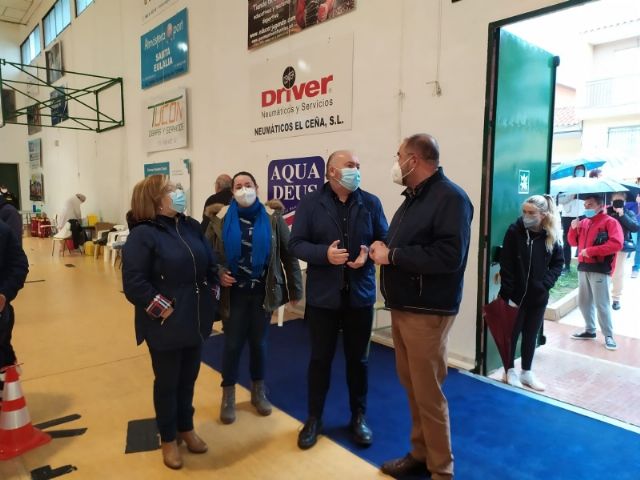 El alcalde, Juan José Cánovas, y la concejala de Sanidad, Inmaculada Blázquez, acompañaron hoy al gerente del Área de Salud III de Lorca, Enrique Casado, y la responsable de Enfermería, Satur Martínez, quienes han visitado la infraestructura municipal para conocer de primera mano cómo se está desarrollando la campaña en este municipio.