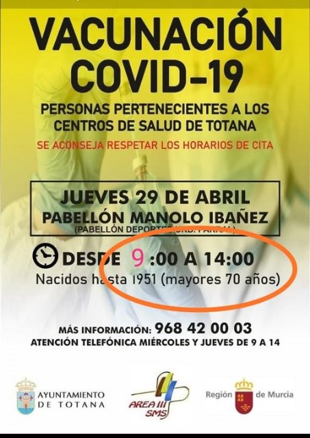 Continua esta semana la vacunación en Totana!! tal y como confirmé el viernes pasado tras las declaraciones del PSOE en rueda de prensa, alertando y alarmado a los vecinos.