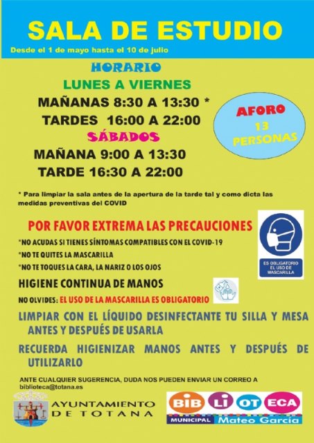 La Concejalía de Cultura comunica que a partir de mañana sábado, día 1 de mayo y hasta el 10 de julio, se retoma el horario de los sábados en la Sala de Estudio del Centro Sociocultural "La Cárcel".