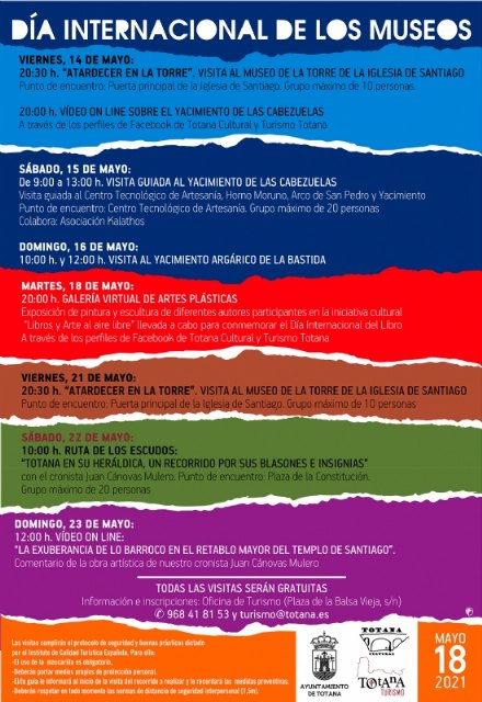 El programa, que incluye actividades presenciales y virtuales, arrancará el viernes 14 de mayo,  a las 20:30 horas, con la visita al Museo de la Torre de la iglesia de Santiago “Atardecer en la torre” (grupo máximo de 10 personas), y el vídeo on line sobre el yacimiento de Las Cabezuelas a través de los perfiles de Facebook de Totana Cultura y Turismo Totana.