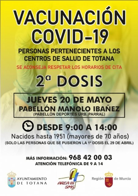 Totana acogerá este jueves, día 20 de mayo, otra nueva jornada de vacunación masiva contra el COVID-19, en el Pabellón de Deportes “Manolo Ibáñez”, dando continuidad a la campaña promovida por Salud Pública desde hace varias semanas en este municipio y el conjunto de la Región de Murcia.