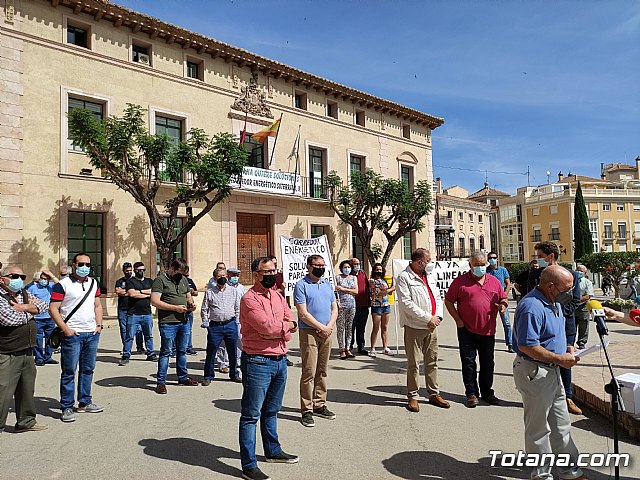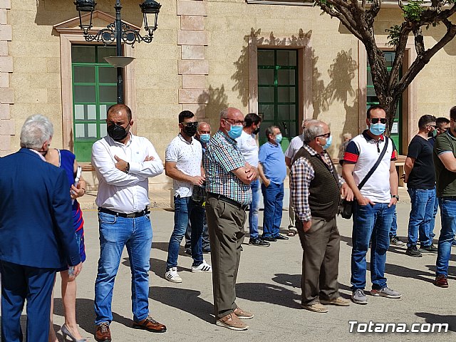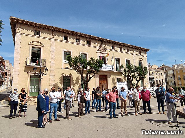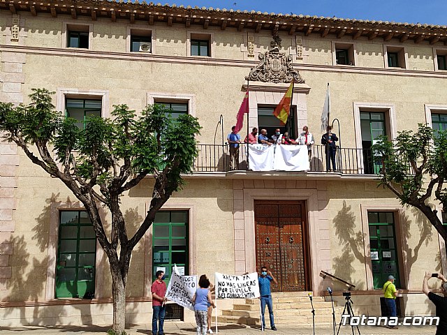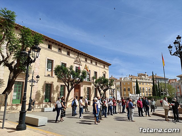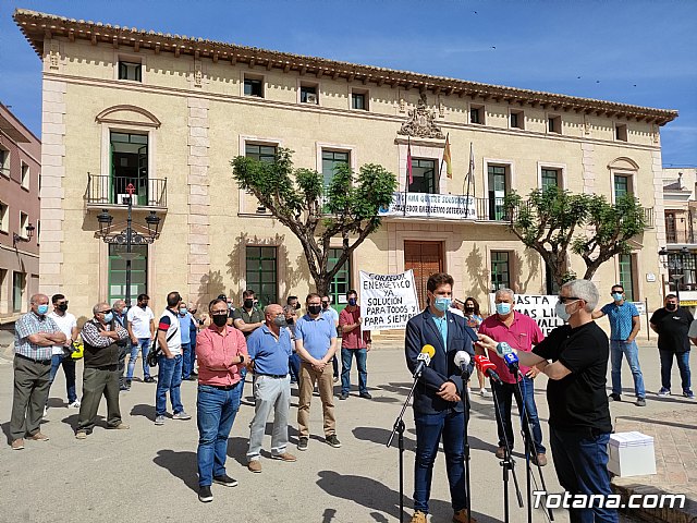 Más de medio centenar de afectados se concentraron hoy para apoyar el simbólico acto de colocación de una pancarta en la fachada principal consistorial bajo el lema “Totana quiere soluciones. ¡Corredor energético soterrado, ya!”