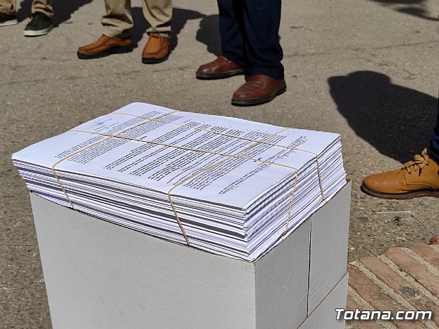 Las familias concentradas escenificaron en la protesta las 4.000 alegaciones presentadas a la modificación del trazado de la Línea de Alta Tensión de la planta solar fotovoltaica de Lorca, cuyo plazo finaliza el próximo día 5 de junio. Se ven afectadas más de 280 familias.