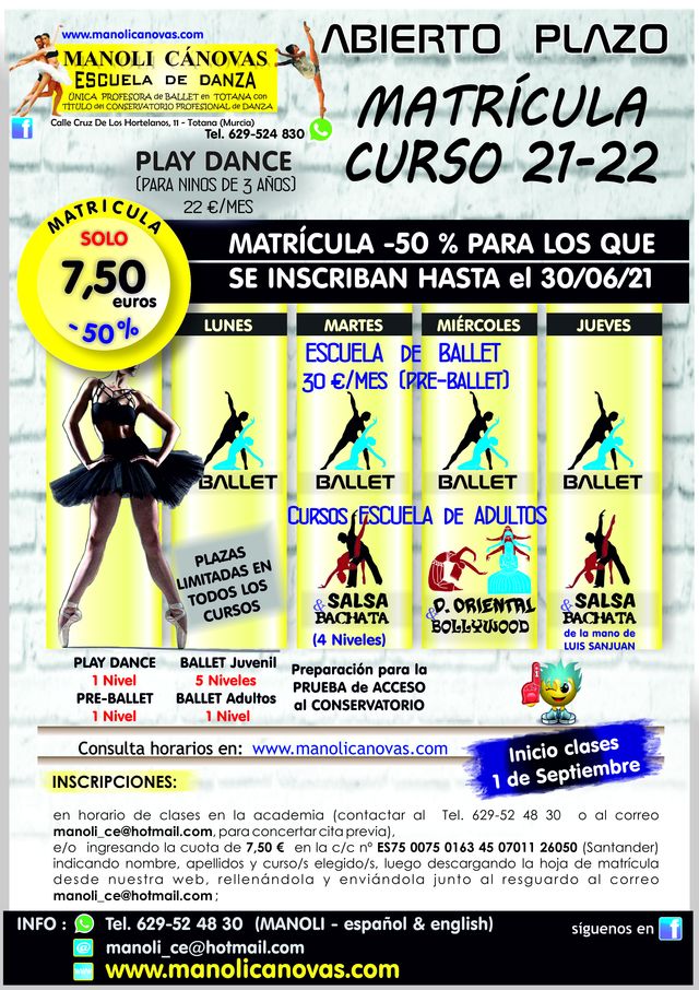 Para mayor información y para inscripciones, se puede contactar con la Escuela de Danza Manoli Cánovas, por teléfono y WhatsApp al 629-52 48 30.
