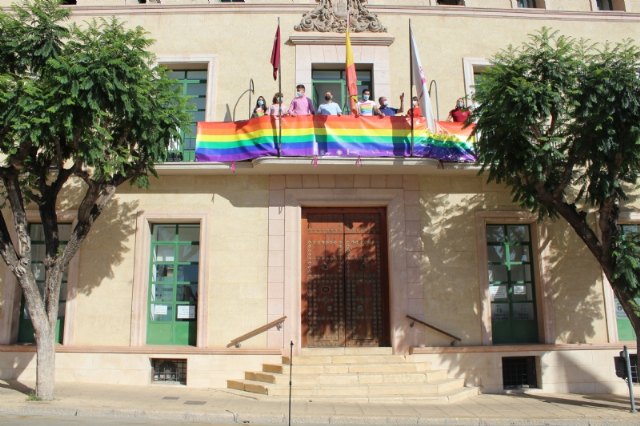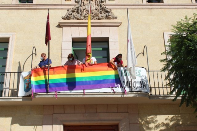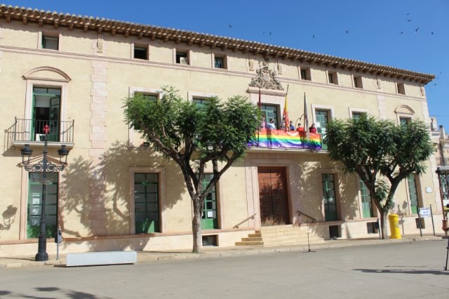 Autoridades municipales colocaron hoy la bandera conmemorativa LGTBI en el balcón de la fachada principal del Ayuntamiento de Totana para visibilizar la defensa de los derechos de este colectivo ciudadano con motivo de la celebración del Día Internacional del Orgullo, que tiene lugar este lunes 28 de junio.