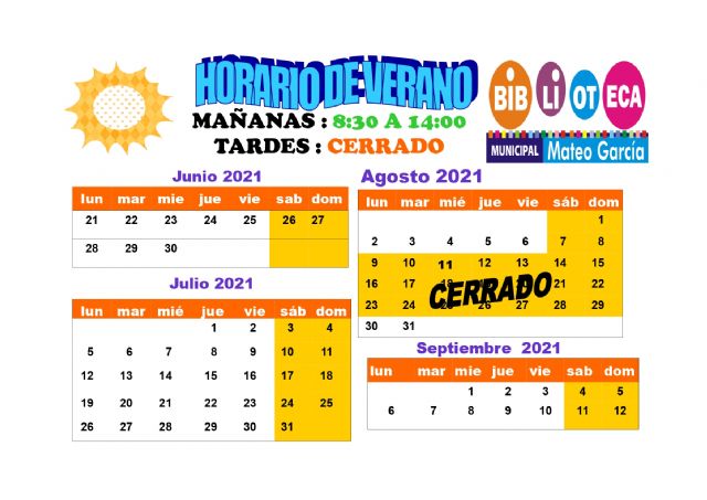 Durante las próximas semanas se mantendrá el horario de verano que se prolongará hasta el 10 de septiembre; y que será de 8:30 a 14:00 horas, de lunes a viernes, permaneciendo cerrado por las tardes.