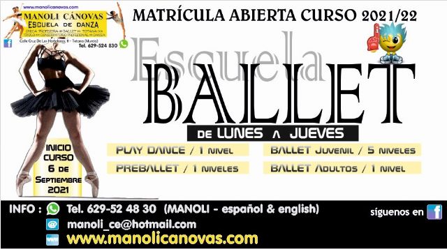 Los interesados pueden contactar a través de WhatsApp en el 629 52 48 30, a través de Facebook Escuela de danza Manoli Cánovas, o correo electrónico para reservar su plaza o para solicitar información sobre alguno de los cursos.